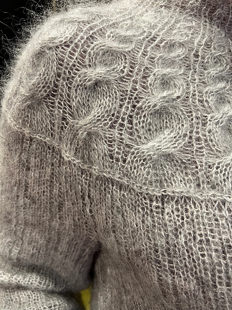 - Deb is wearing the Cozy Winter shawl by Melanie Mielinger in Madelinetosh Farm Twist Copper Pink (would also be gorgeous in Tosh DK); close up of the cable pattern combined with lace.