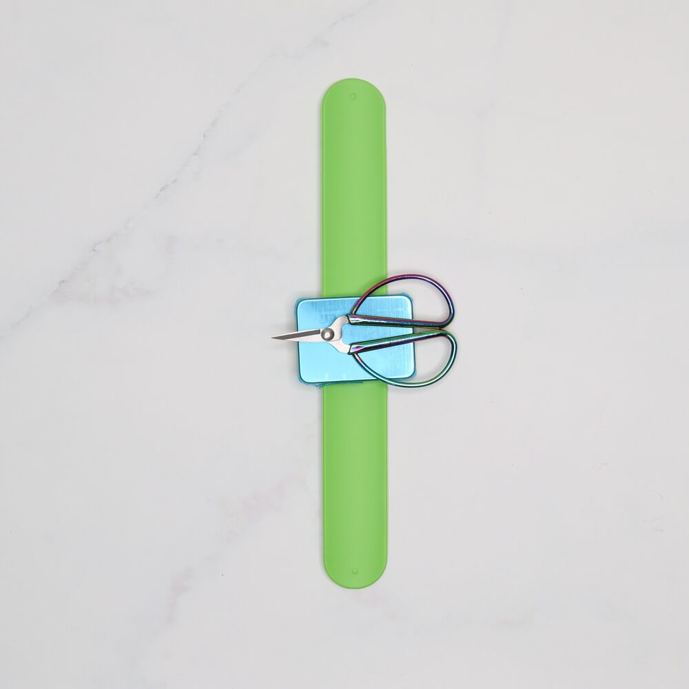 Keep your steel tools and notions close by and ready to use with this convenient by Skein Sisters Notions Band. One size fits all, and it's really easy to take on and off - simply slap to curve it around your wrist and unwind it to take it off and straighten it again. The rectangular magnet slides along the band, so you can position it in the most comfortable spot for you.