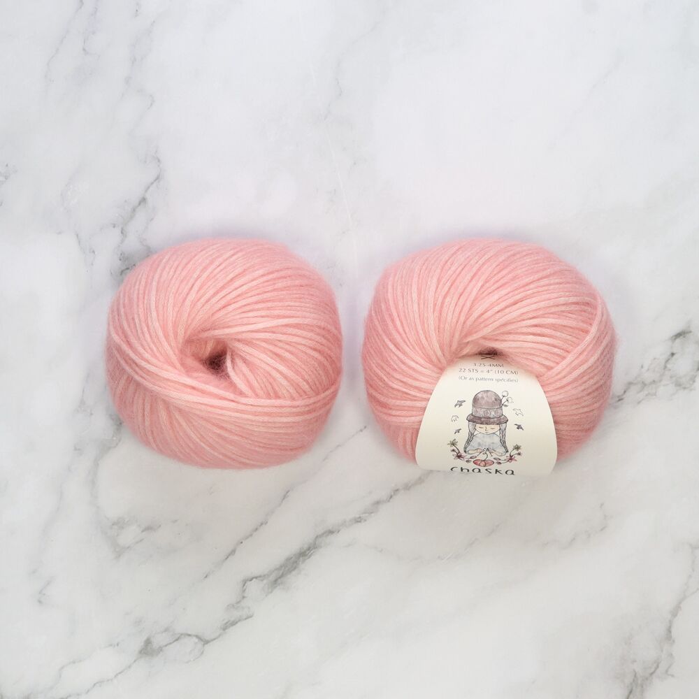 Chaska Wara is a soft DK yarn with a cotton core and baby alpaca and merino fibres blown through it, creating a light halo and gentle marled effect. It knits into a soft, airy fabric with lovely stitch definition for garments and accessories