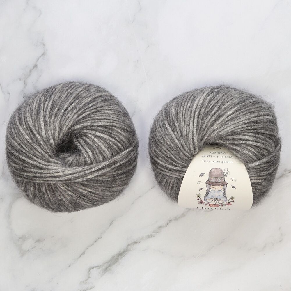 Chaska Wara is a soft DK yarn with a cotton core and baby alpaca and merino fibres blown through it, creating a light halo and gentle marled effect. It knits into a soft, airy fabric with lovely stitch definition for garments and accessories