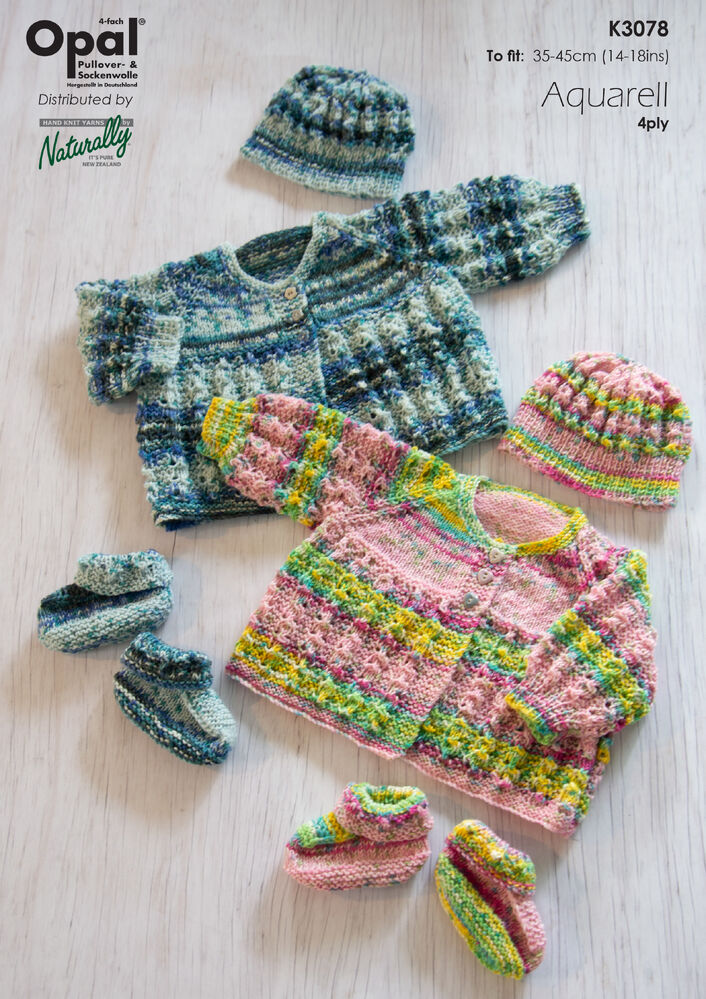 Pattern leaflet: This sweet and lacey baby's matinee jacket, booties and beanie set is knit in fun Opal Aquarell 4ply, a self-striping fingering weight wool/nylon blend yarn which comes in a range of lovely pastel colours.