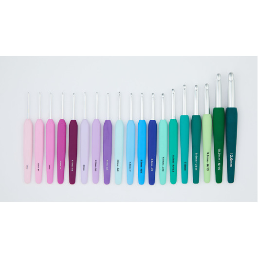 The new, more tapered aluminium hooks glide effortlessly through tight stitches and the ergonomic rubber handles are colour-coded for easy identification and offer hours of comfortable crocheting.