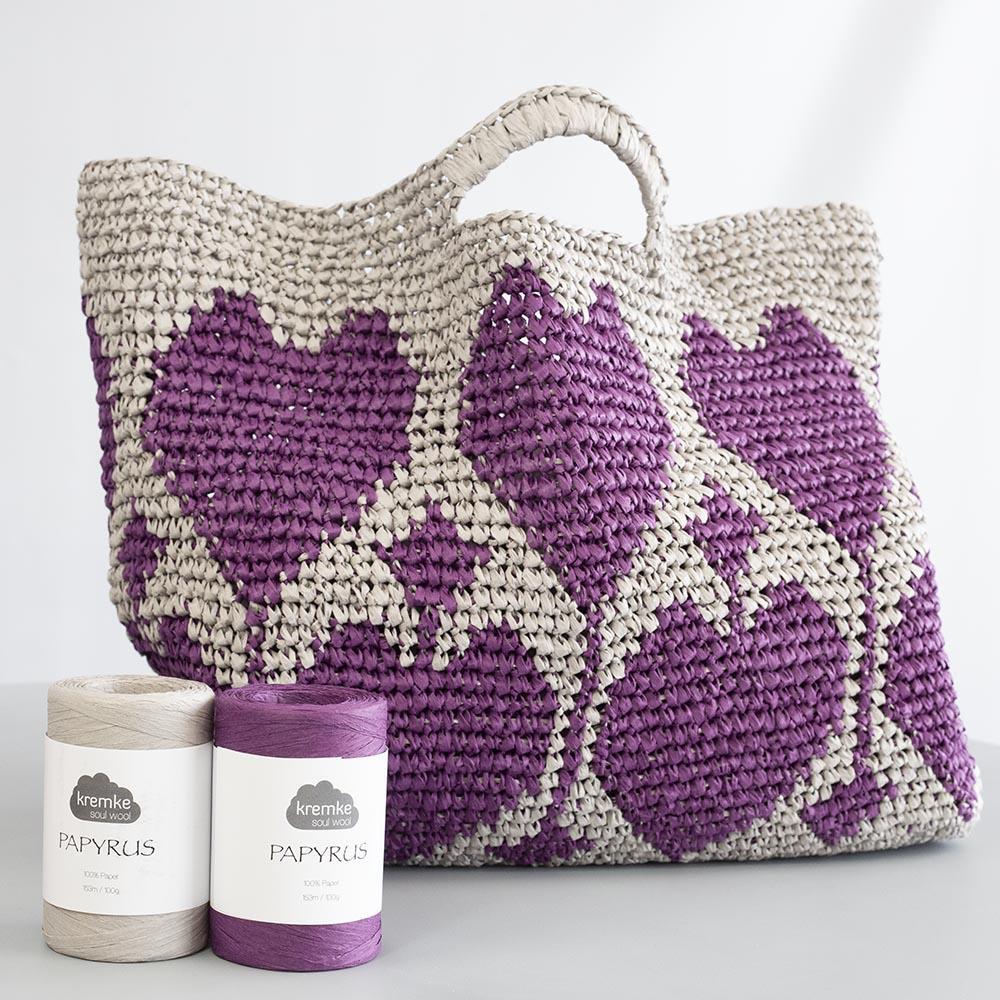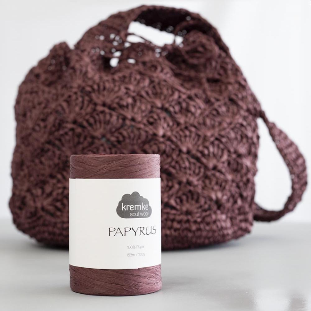 Kremke Soul Wool Papyrus is produced from paper, but is water-resistant and may be wiped with a damp cloth. The yarn is flexible, although it handles differently from wool or cotton, and it maintains its flexibility after it's crocheted. You can find all the colours of Papyrus here.