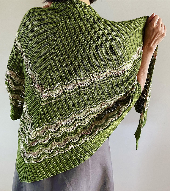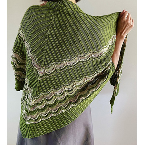 Krisanteema is a symmetrical triangular shawl knit top down with a Garter Tab Cast-On and increases along the edges and its central spine to obtain its final shape. In the scalloped petal sections the alternating colours are carried along the right edge of RS rows and the shawl is finished with the Stretchy Ribbing Bind-Off to ensure a clean and controlled stretch of the ribbing.