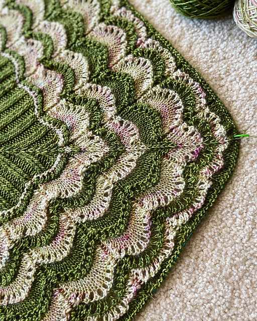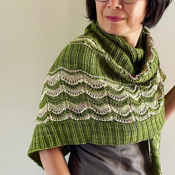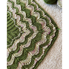 Krisanteema is specifically designed to highlight the properties of yarns with a high silk content and sheen, so is perfect for our gorgeous Skein Sisters Romance yarn. The shawl features a simple ribbing in the main body section worked in MC, interrupted by more delicate scalloped petal panels alternating between CC and MC.The simple knit stitch texture of the scalloped petals allows a smooth surface to showcase the full, unobscured gradience of a CC.