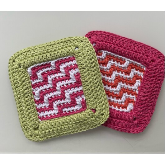 Learn overlay mosaic crochet in this fun workshop while while working on you own sample in class. Discover how to do mosaic square & then add a border to hide all the yarn ends! All . Great for advanced beginners & up, for left & right handed crocheters