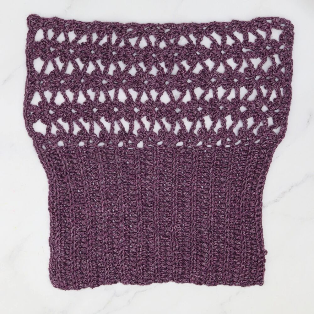 - Crocheted swatch for Two Row Tee by Joanne Scrace in colour 1371 Lilac