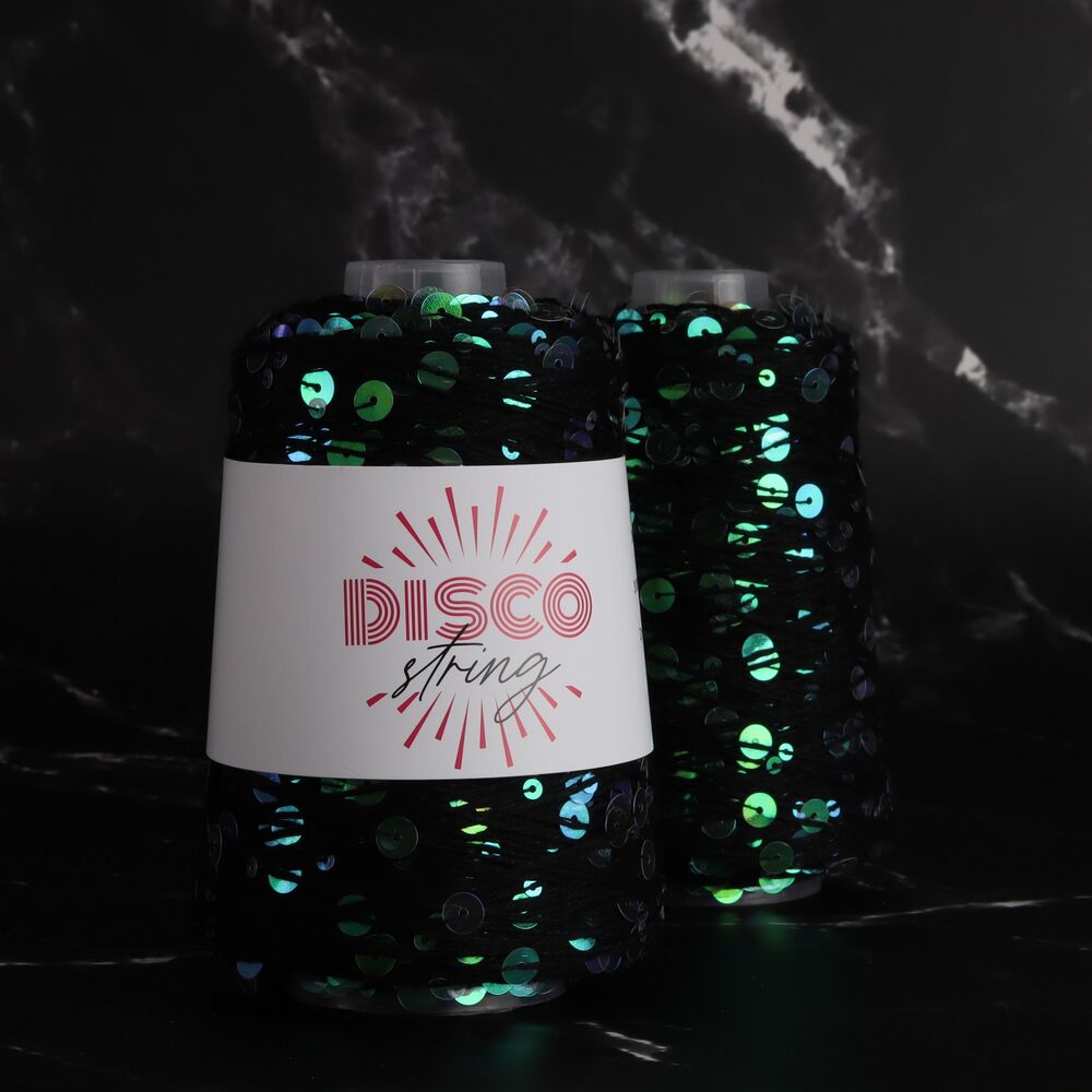 Disco String is a 5ply cotton thread dotted with 3mm and 6mm sequins, made to be held alongside your knitting for an instant glow up. Add shimmer, texture and just a little drama to any project – because sometimes more really is more.