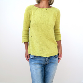 This light and summery Sunshine Coast pullover is quite simple in appearance, but comes with a few little design details such as eyelets and side panels that make it really special! The A-line body shape is flattering on many body types. It is intended to fit with 1.5 to 7.5cm of ease at the bust.
